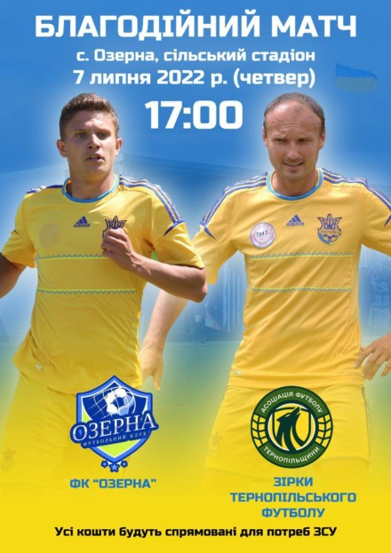 Сьогодні, 7 липня, Координаційний центр підтримки Збройних Сил України Асоціації футболу Тернопільщини організовує черговий з серії благодійних матчів команди зірок тернопільського футболу. Цього разу наші зірки проведуть поєдинок в Озерній, де в суперниках буде місцевий ФК «Озерна».