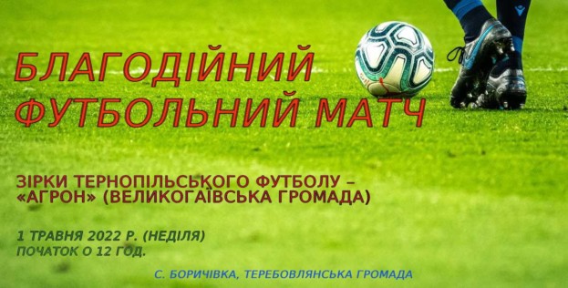 У неділю, 1 травня, Координаційний центр підтримки Збройних Сил України Асоціації футболу Тернопільщини організовує благодійний матч між командами зірок тернопільського футболу та чемпіоном Тернопільської області 2021 року – великогаївським «Агроном».