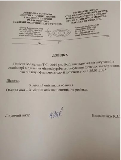 “Тарас отримав сильні опіки обличчя та очей. Ми одразу відвезли його до міської дитячої лікарні. Там надали першу медичну допомогу й порекомендували їхати до інституту в Одесу. Наступного дня ми вирушили. Із минулої суботи перебуваємо тут на лікуванні”, – продовжує пані Наталія.