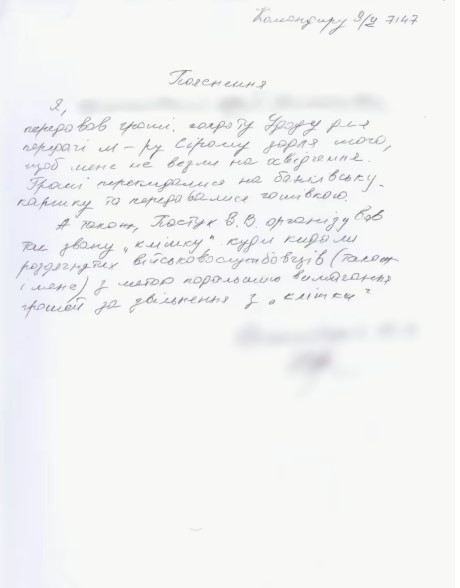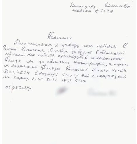 Дослівно з пояснення зі збереженням стилістики і пунктуації: “Даю пояснення з приводу мого побиття в районі виконання бойових завдань в Донецькій області. Моє побиття організував ст. лейтенант Пастух про що свідчить фотографія, а також ст. лейтенант Пастух вимагав в мене кошти 8.03.2024 в розмірі 5000 гр…”