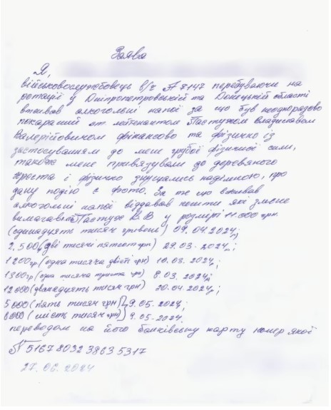 Заява військового щодо вимагання грошей і побиття