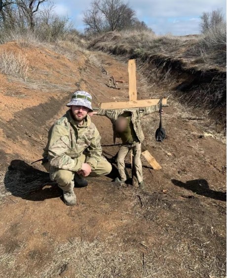 Владислав Пастух фотографується на тлі прив’язаного до хреста військовослужбовця