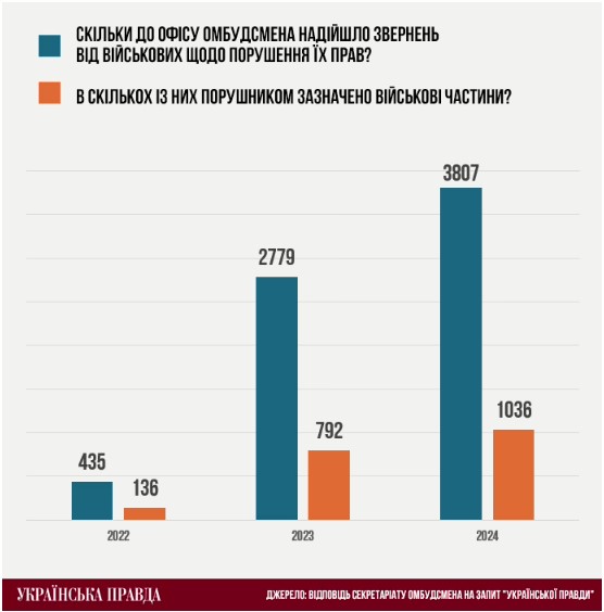Секретаріат омбудсмена у відповідь на запит УП повідомив, що за одинадцять місяців 2024 року бійці надіслали 3807 звернень щодо порушення своїх прав, серед яких орієнтовно третина – скарги на військові частини.