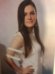 На ній була вдягнена світло-сіра піжама, світло-рожева куртка, а також бежеві кросівки. Дівчина носить окуляри.