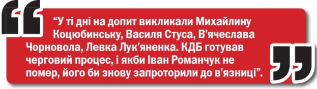 37 років потому пані Леся познайомилась у Будинку творчості письменників, що в Ірпені під Києвом, з племінницею великого Коцюбинського, Михайлиною, і в розмові згадала про ці слова батька. Пані Михайлина почала її розпитувати, а потім розповіла, що в ті дні на допит викликали її, Василя Стуса, В’ячеслава Чорновола, Левка Лук’яненка. КДБ готувала черговий процес, і якби Іван Романчук не помер, його би знову запроторили до в’язниці.