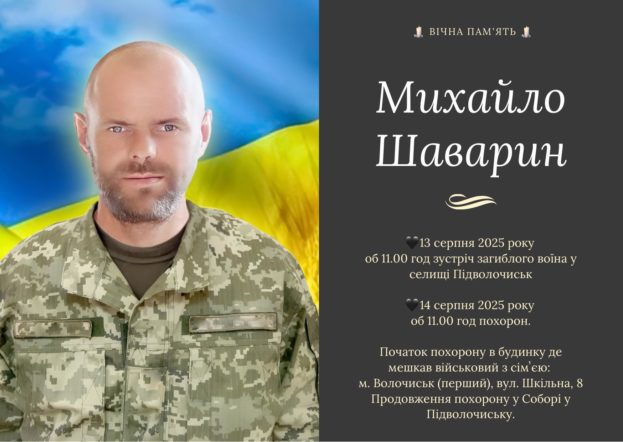 Нагадаємо, на 40-му році життя відійшов у вічність житель селища Підволочиськ, молодший сержант 105-ої окремої бригади територіальної оборони Михайло Вікторович Шаварин  (21 серпня 1984 р.н.). 9 серпня 2025 року під час виконання бойового чергування на пункті спостереження на Харківщині він раптово відчув погіршення стану здоров’я, був госпіталізований, але, на жаль, серце Захисника зупинилося.