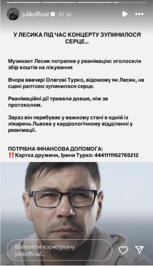 Зараз артист у реанімації, на його лікування збирають кошти. Про це заявив співак Юлік в Instagram. За його словами, у Лесика зупинилося серце просто під час концерту.