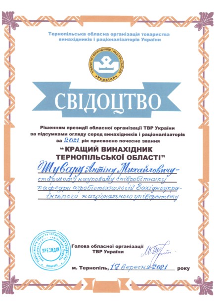 Доктору сільськогосподарських наук, в.о. завідувача кафедри агробіотехнологій Західноукраїнського національного університету Антіну Шувару за рішенням президії Тернопільської обласної організації товариства винахідників і раціоналізаторів України від 12 вересня 2021 року присвоєно почесне звання «Кращий винахідник Тернопільської області».