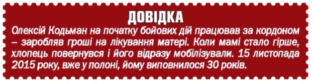 Про те, що Олексій Кодьман потрапив у полон, його рідні дізналися вранці на другий день, 13 листопада. Їм розповіли волонтери. Хоча у військовій частині не підтверджували понад тиждень. Говорили, що хлопці просто не повернулися із завдання, з ними немає зв’язку. Через десять днів приїхав представник військової частини в Тернопіль, запросив у військкомат сестру та маму Олексія. Тоді й усе розповів…